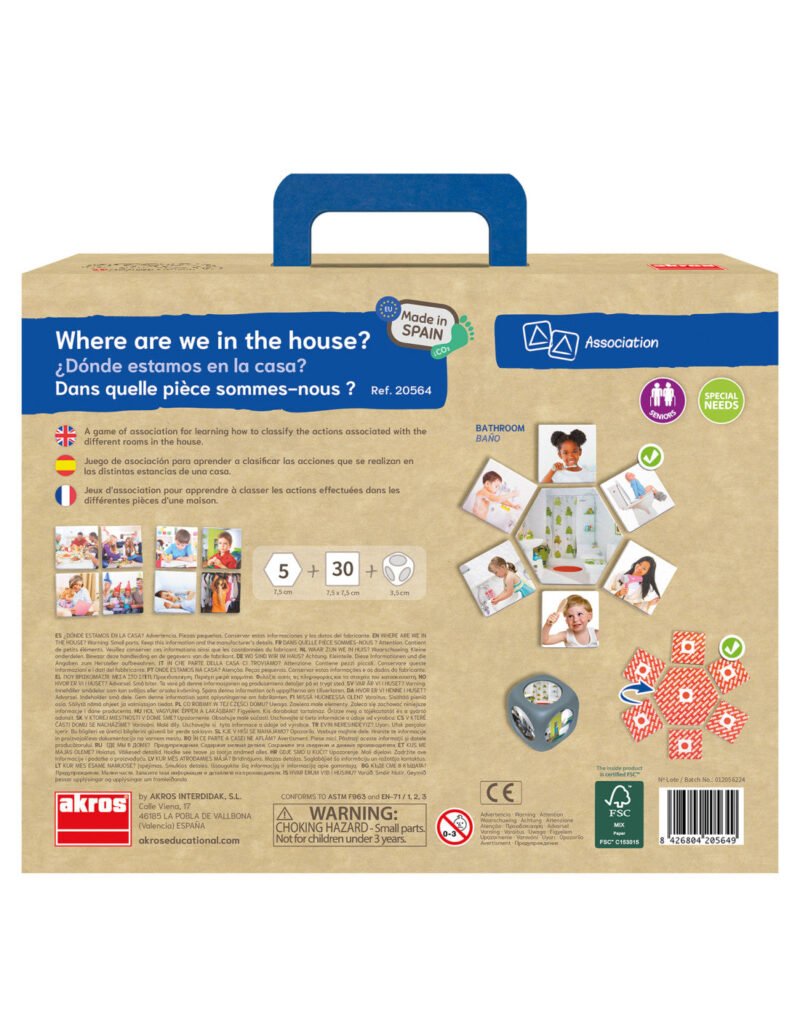 „Kur mes namuose?“ – tai smagus ir prasmingas žaidimas-asociacija, sukurtas pagal AKROS Educational metodiką, padedantis vaikams suprasti ir įvardyti veiklas skirtinguose namų kambariuose. Šis žaidimas puikiai tinka ankstyvajam ugdymui, kalbos vystymuisi bei logikos ir žodyno lavinimui.