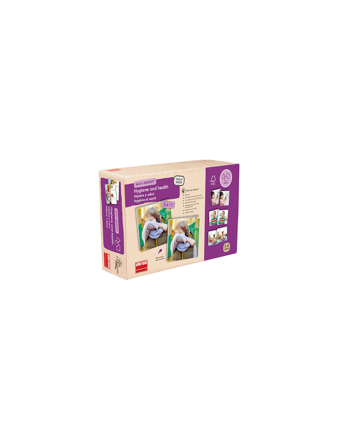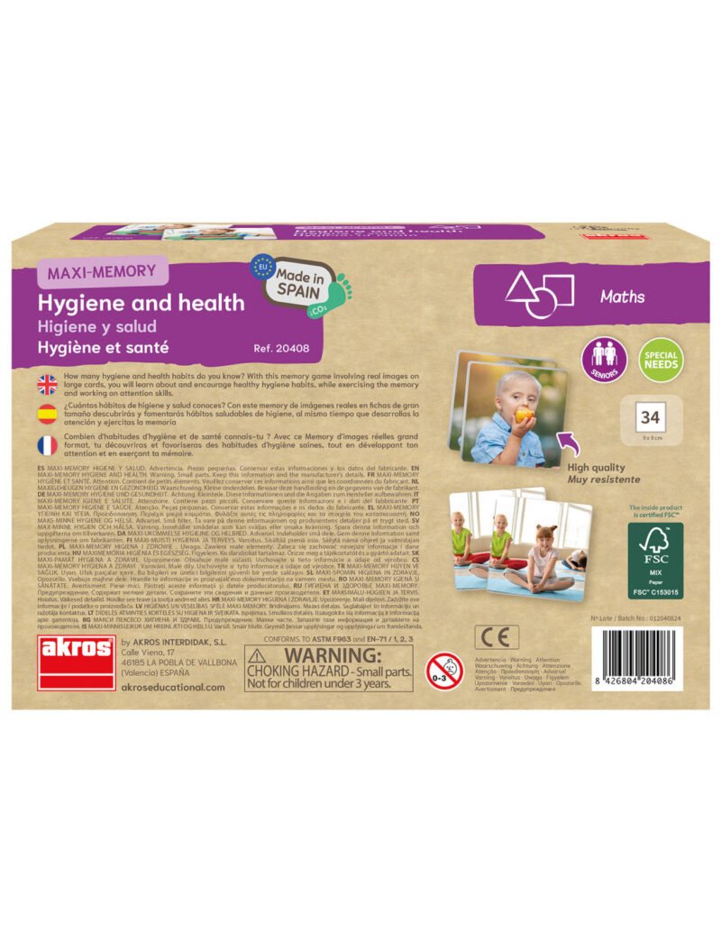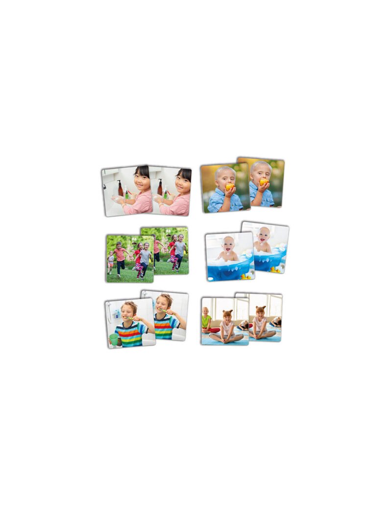 Maxi-Memory „Higiena ir sveikata“ – tai lavinamasis atminties žaidimas vaikams, kuriame kortelėse vaizduojamos kasdienės higienos ir sveikatingumo veiklos. Žaidimo metu vaikai mokosi atpažinti ir susieti veiklas, taip lavindami atmintį, dėmesį, kalbą ir kasdienės rutinos supratimą.