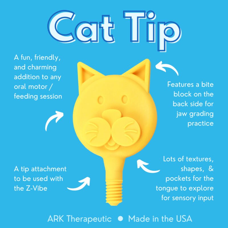 ARK Cat Tip – tai sensorinis burnos motorikos antgalis, skirtas naudoti kartu su Z-Vibe® vibraciniu korpusu. Šis antgalis turi unikalią liežuvio formą, kuri suteikia švelnų, bet įtaigų jutiminį stimulą ir yra tinkamas sensoriniam lavinimui bei burnos motorikos pratimams.